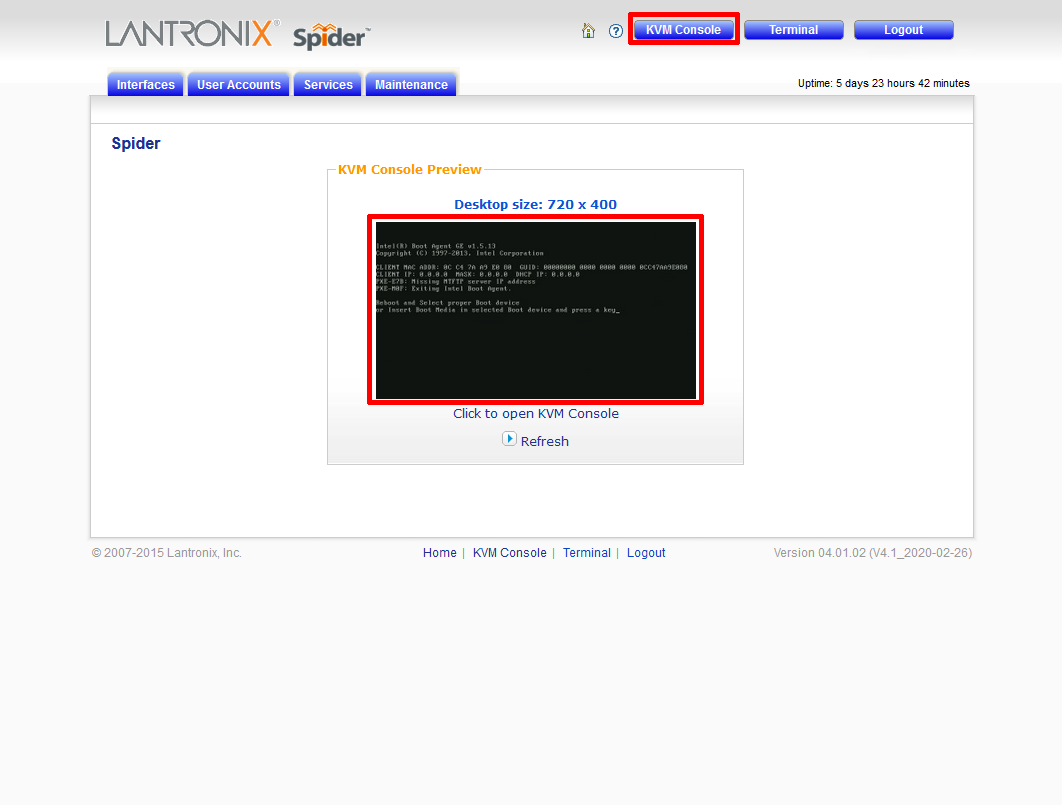 Na úvodní obrazovce je náhledový snímek displeje serveru. Kliknutím na náhled, nebo na tlačítko "KVM Console" se stane jedna ze dvou možných věcí: