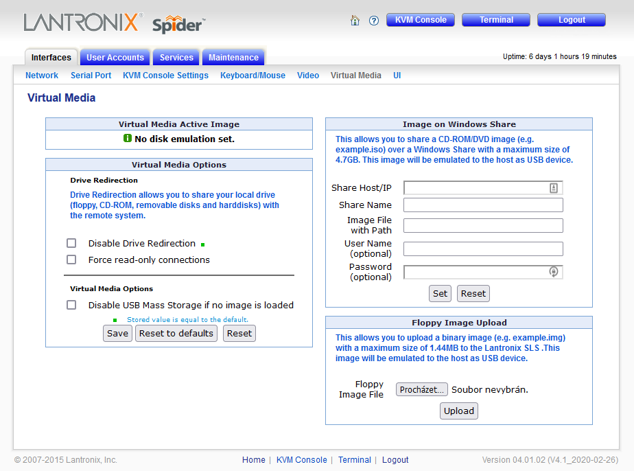 Pokud se Vám stáhne Java applet, je potřeba jej spustit příkazem "javaws *cesta ke staženému souboru*"- Dlouhá packa umí také vzdáleně připojit Vaši lokální CD-ROM pro nabootování z fyzického disku nebo připojení obrazu disku dostupného pod Windows Share / SAMBA serverem. Vybraný obraz bude serveru prezentován ve formě USB zařízení.